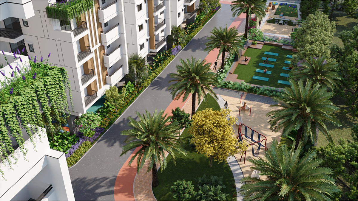 Radhey Skye spans 10 acres with 7 high-rise towers (G + 23 floors) and 1419 luxury apartments. The project features green open spaces and a 2,00,000 sq.ft lifestyle zone, offering residents a complete gated community experience in Kollur Hyderabad.